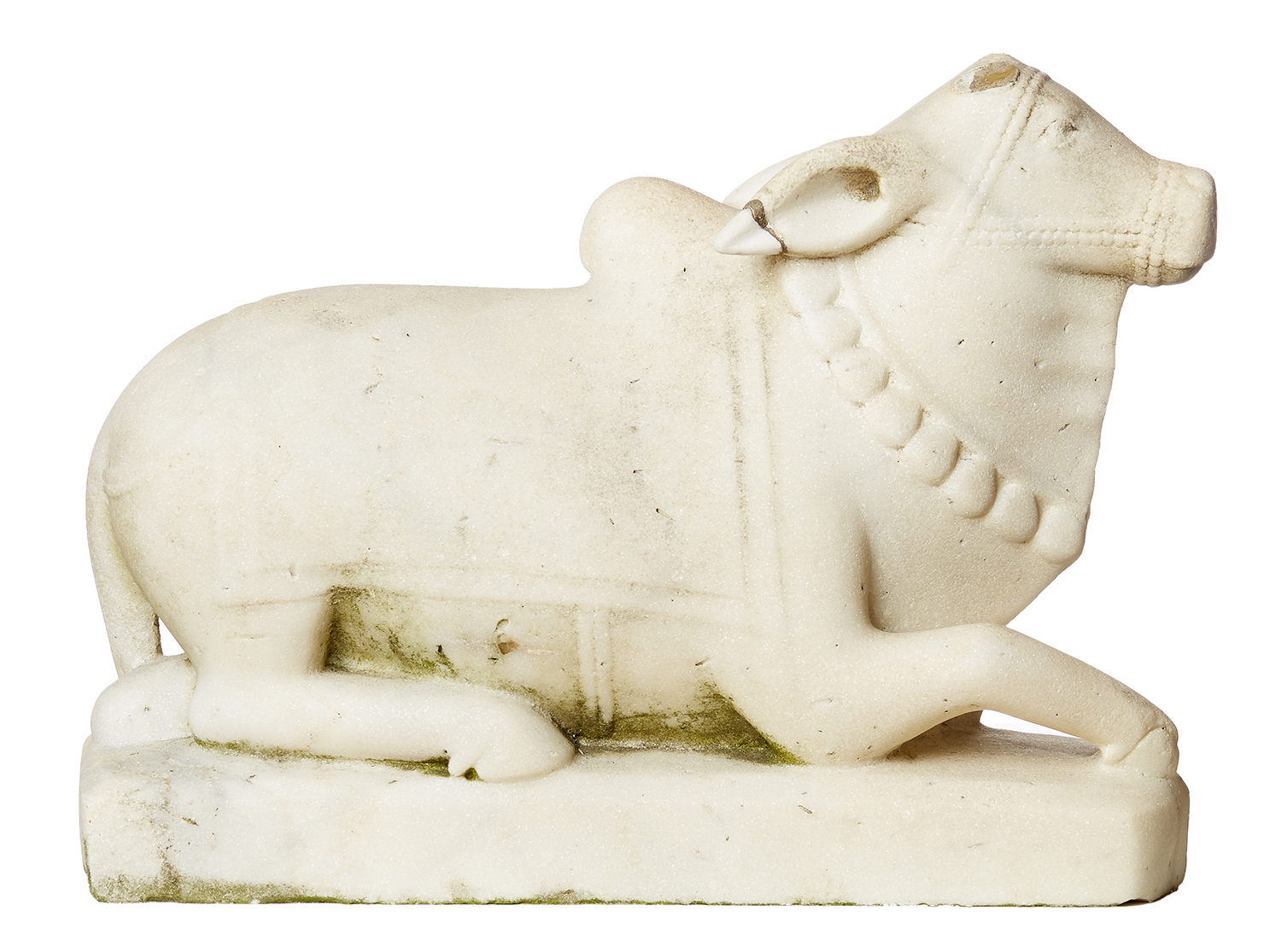 Sensitively modeled as a seated caparisoned bull looking forward intently