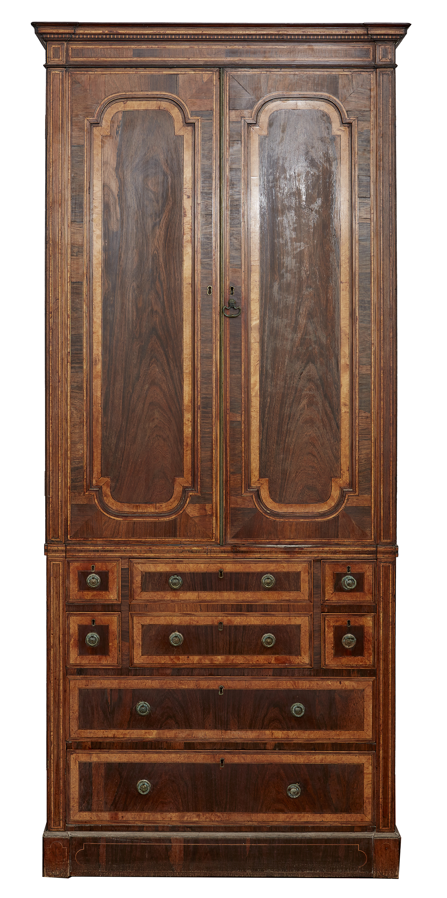 A GEORGE III MAHOGANY, BURL AND ROSEWOOD CROSSBANDED LINEN PRESS