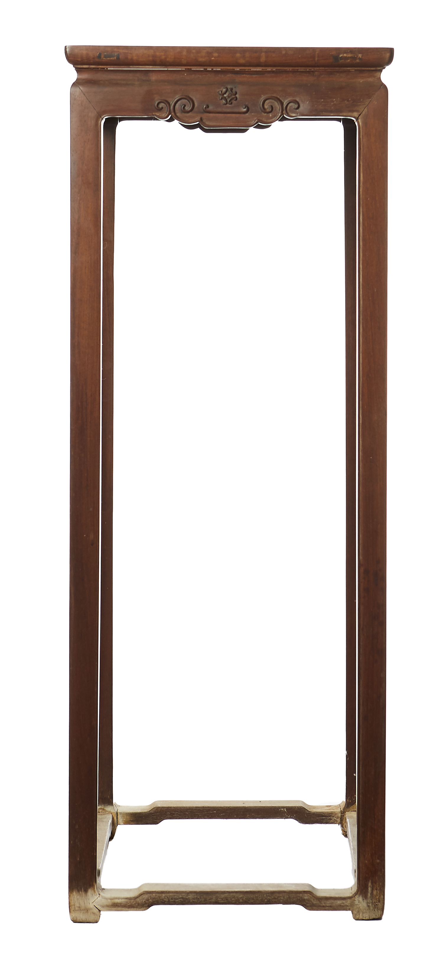 The tall stand largely undecorated but with a carved detail of a cloud collar to the apron, in a dark brown finished hardwood.