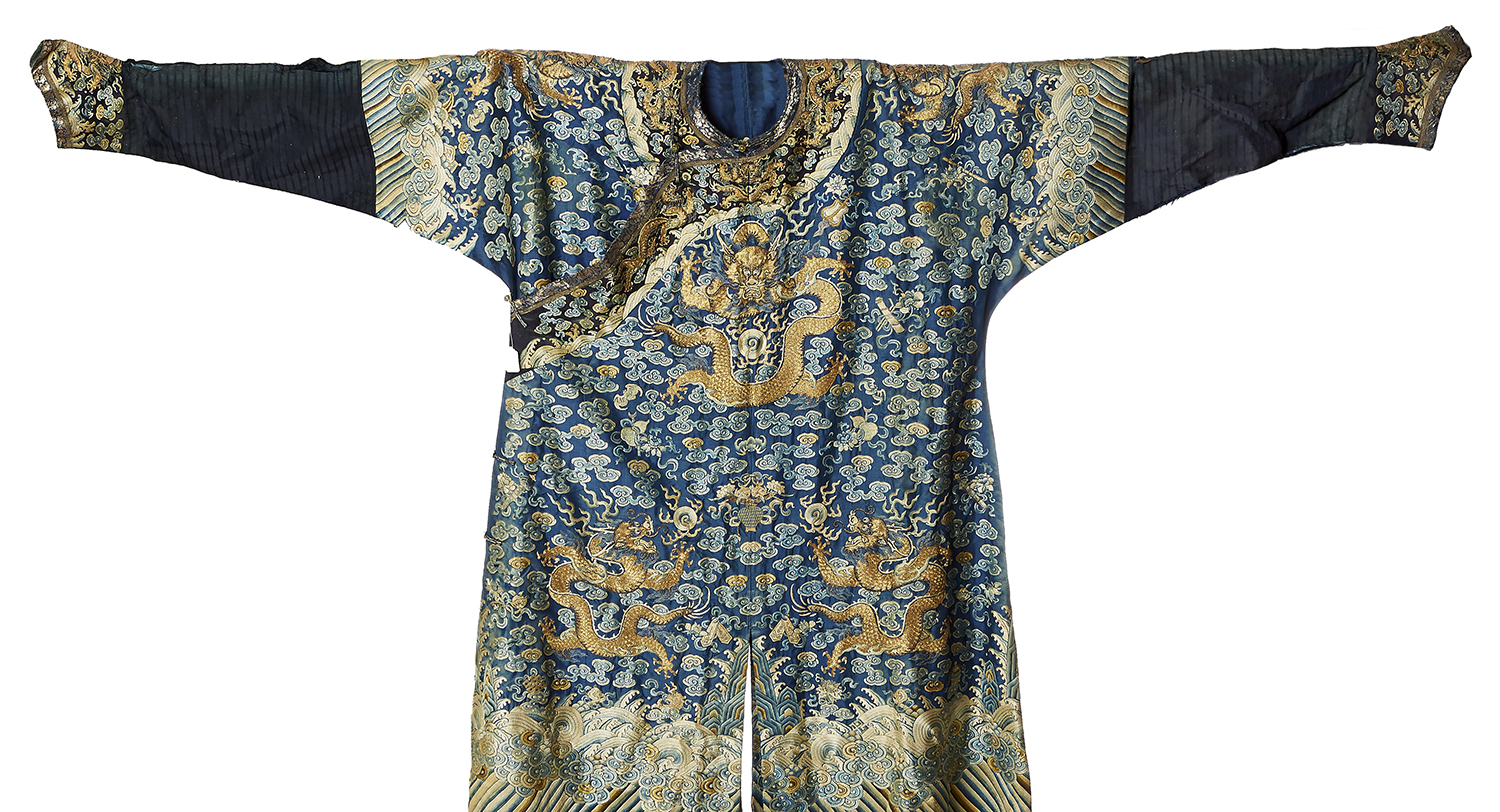 The nine dragon robe with golden dragons writhing amoungst clouds, chasing flaming pearls surrounded by precious buddhist emblems above a lower border of stylized mountains and waves. With an elaborate collar featuring further embroidered golden dragons