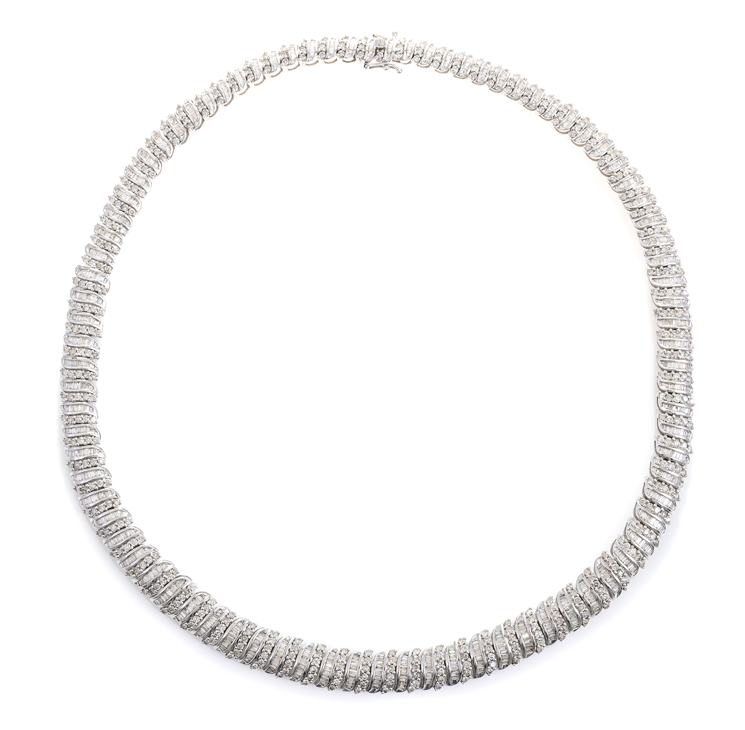 The graduated necklace comprising round brilliant cut diamonds totalling 7.50cts, and baguette cut diamonds totalling 5.00cts, mounted in 18ct white gold, total length 460mm.