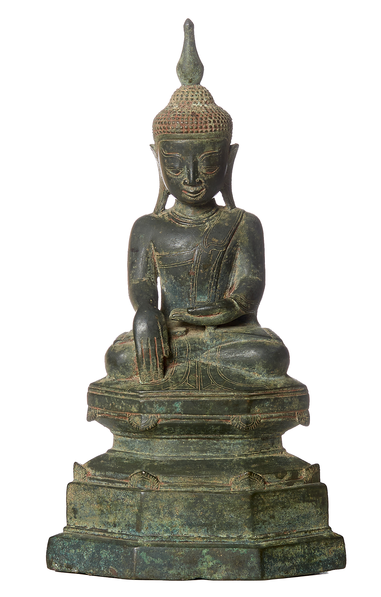 Seated in bhumisphara Mudra with serene downcast eyes, with an inscription to the reverse