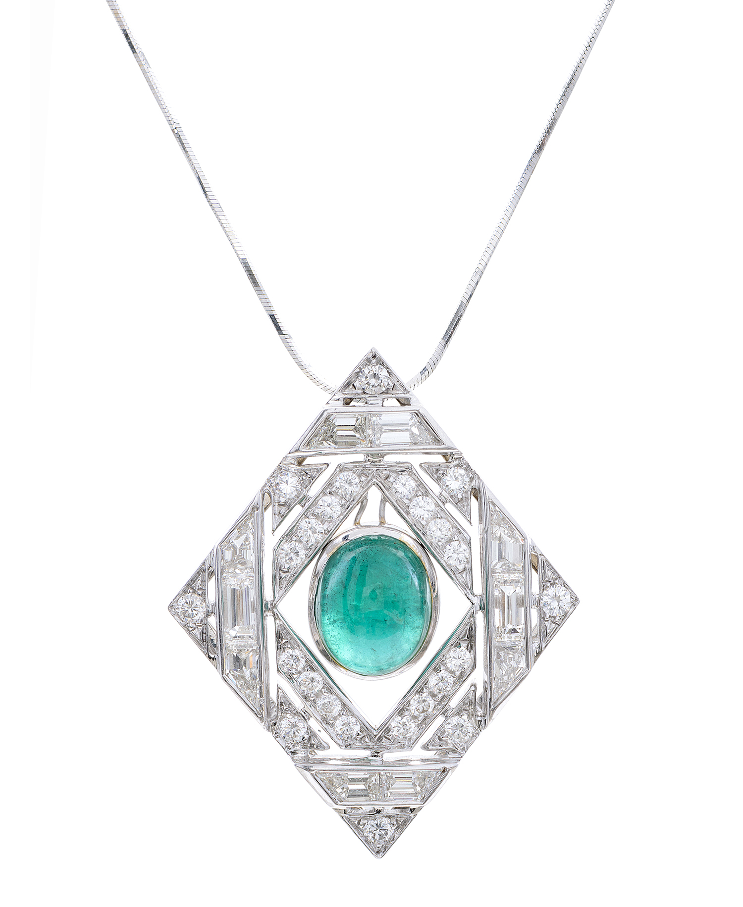 Comprising an oval emerald cut en cabochon of 2.50cts, within a pierced diamond shaped plaque set with baguette and round brilliant cut diamonds totalling 2.70cts, mounted in 18ct white gold, to a conforming chain.