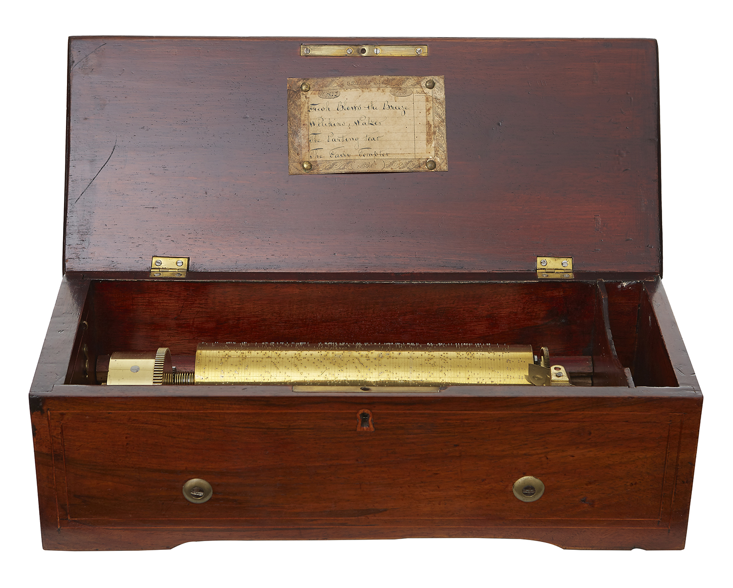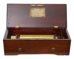 In good working order, wooden casing In good, Well polished condition. Underside of casing has handwritten number: 28098 in ink and repeated in pencil. Lock has not been checked, key missing. Complete with winder key. Item was lotted in a Christies auction. 5877 hand scratched on to side of cylinder. Cylinder measures 20.5cm approximately.