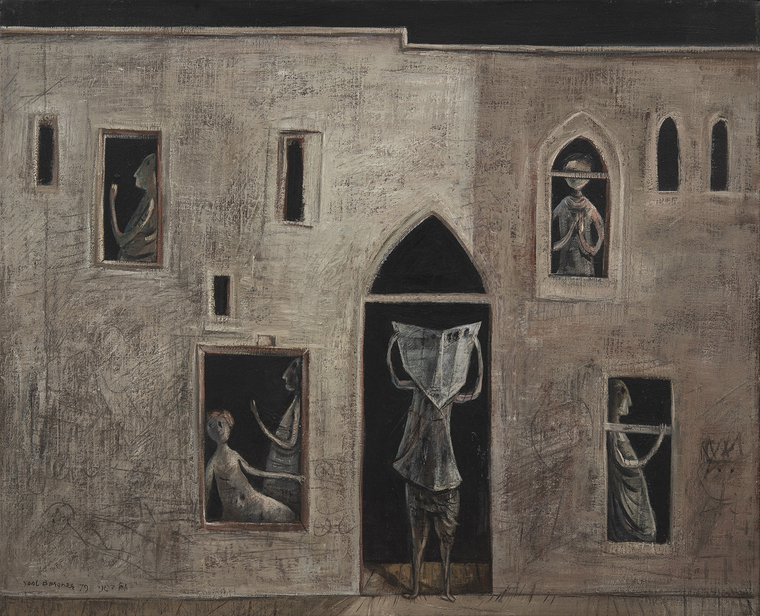 "A characteristic of much of Yosl Bergner's painting is the suggestion of theatrical space, the volume of a stage: a steep, diminished perspective in which the front plane rises almost to the top edge of the picture. The different objects are arranged on this plane in such a way that what is higher, is in fact further away from the eye of the observer. It is a perspective which has something naïve about it and is reminiscent of the early paintings of the Middle Ages. It is also a pictorial approach which suits Bergner as a designer for the theatre."