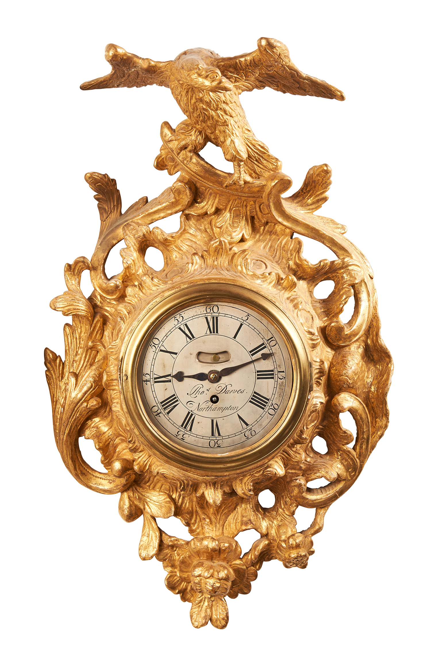 The case carved with scrolls, stylized acanthus leaves and swags in asymmetric manner, surmounted by a stylized carved eagle. The silvered dial signed Thos. Dawes - Northampton with Roman and Arabic numerals. False pendulum aperture above centre arbour. Eight day fusee timepiece movement with spring driven verge escapement.