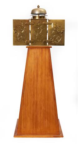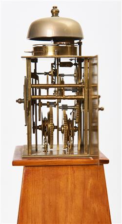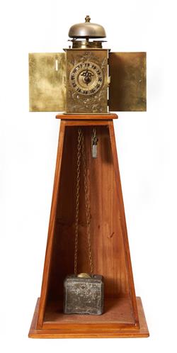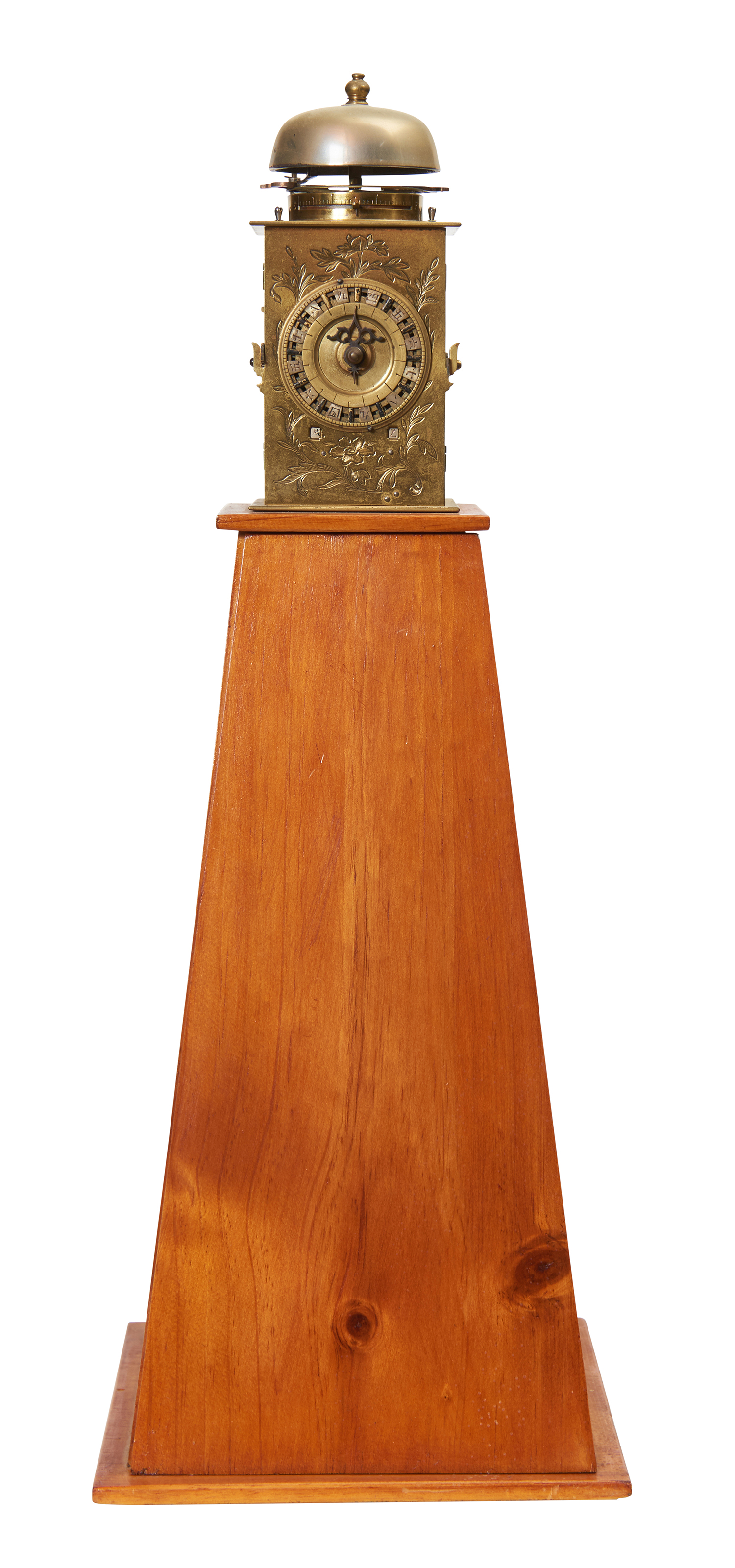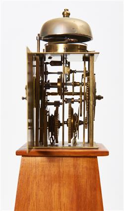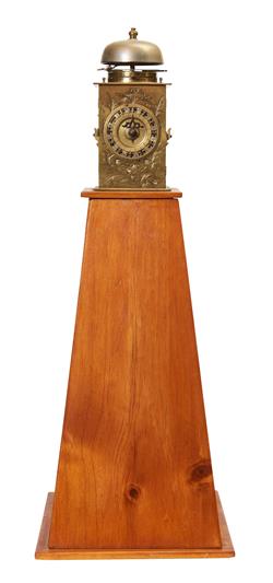 The brass and iron case with side and rear panels with engraved decoration, mounted on a tapering wooden stand. The weight driven movement balance wheel verge escapement