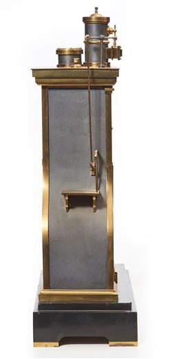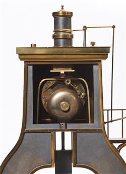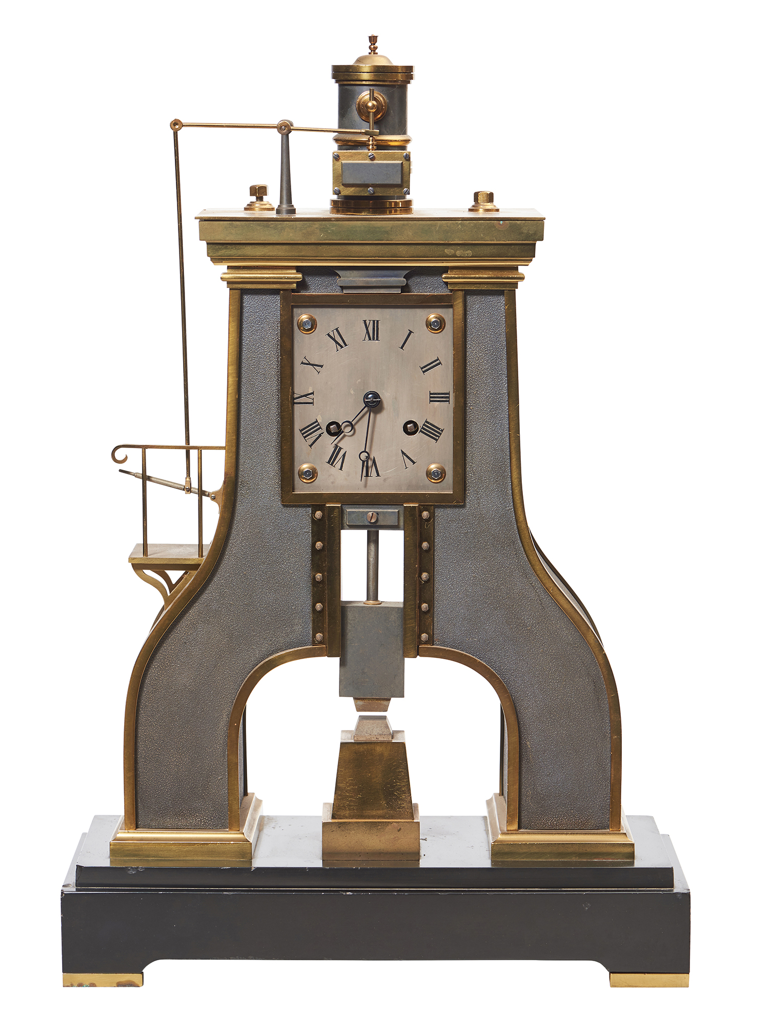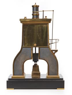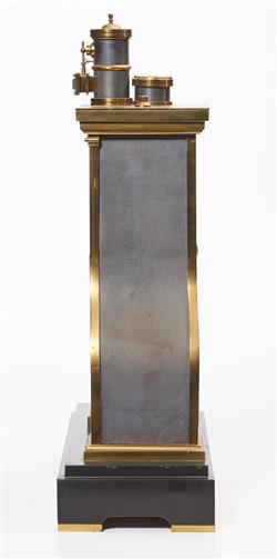 Model replica of the Nasmyth steam hammer. The case in the form of an inverted 'Y', decorated with gilt trim simulated levers and a steam cylinder mounted on top of the case. The pendulum forms the steam hammer. The whole mounted on a black marble base. Eight day, two train, bell striking movement with going barrels.