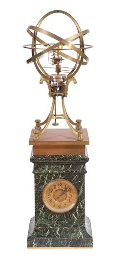 A dark green variegated marble clock base with orrery mounted to top. The clock dial with a gilded finish and Arabic numerals. Signed George Philip & Son- 32 Fleet street- London
