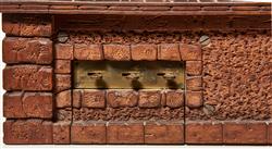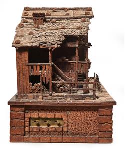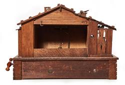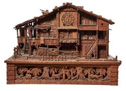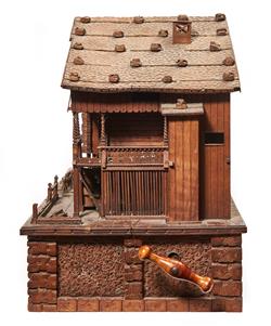 Modelled as a Swiss chalet. One half of the chalet has been made in the form of a run down house, the other portion shown tidy, well kept, maintained and used as a residence. The base decorated with bears, eagle and foxes. Striking clock with a six tune music box to base