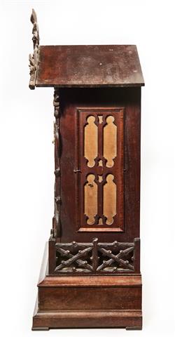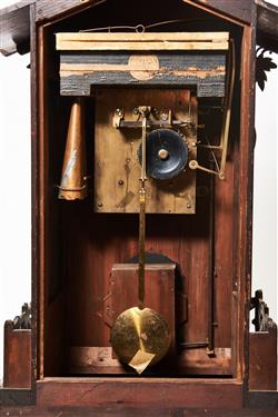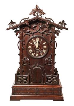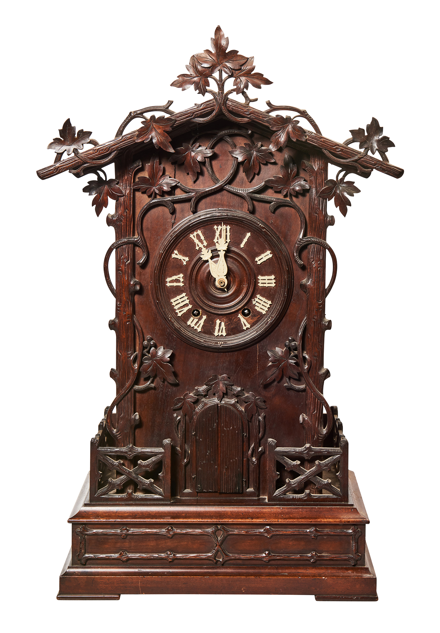 Elaborately carved oak case mantle clock with doors below dial that open on the hour for the trumpeter to perform