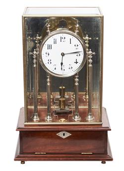 The five glass case, with a nickel plated surround, and a mirror to rear panel. The nickel plated pillars enclosing a white enamel dial with Arabic numerals. Battery compartment in walnut base