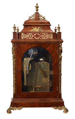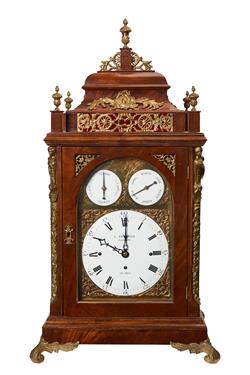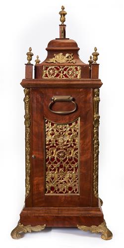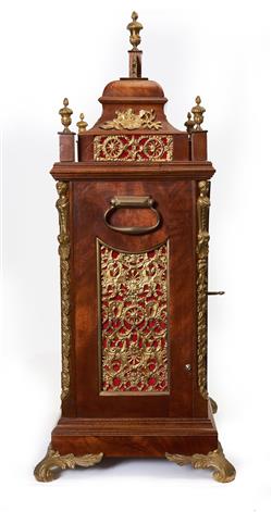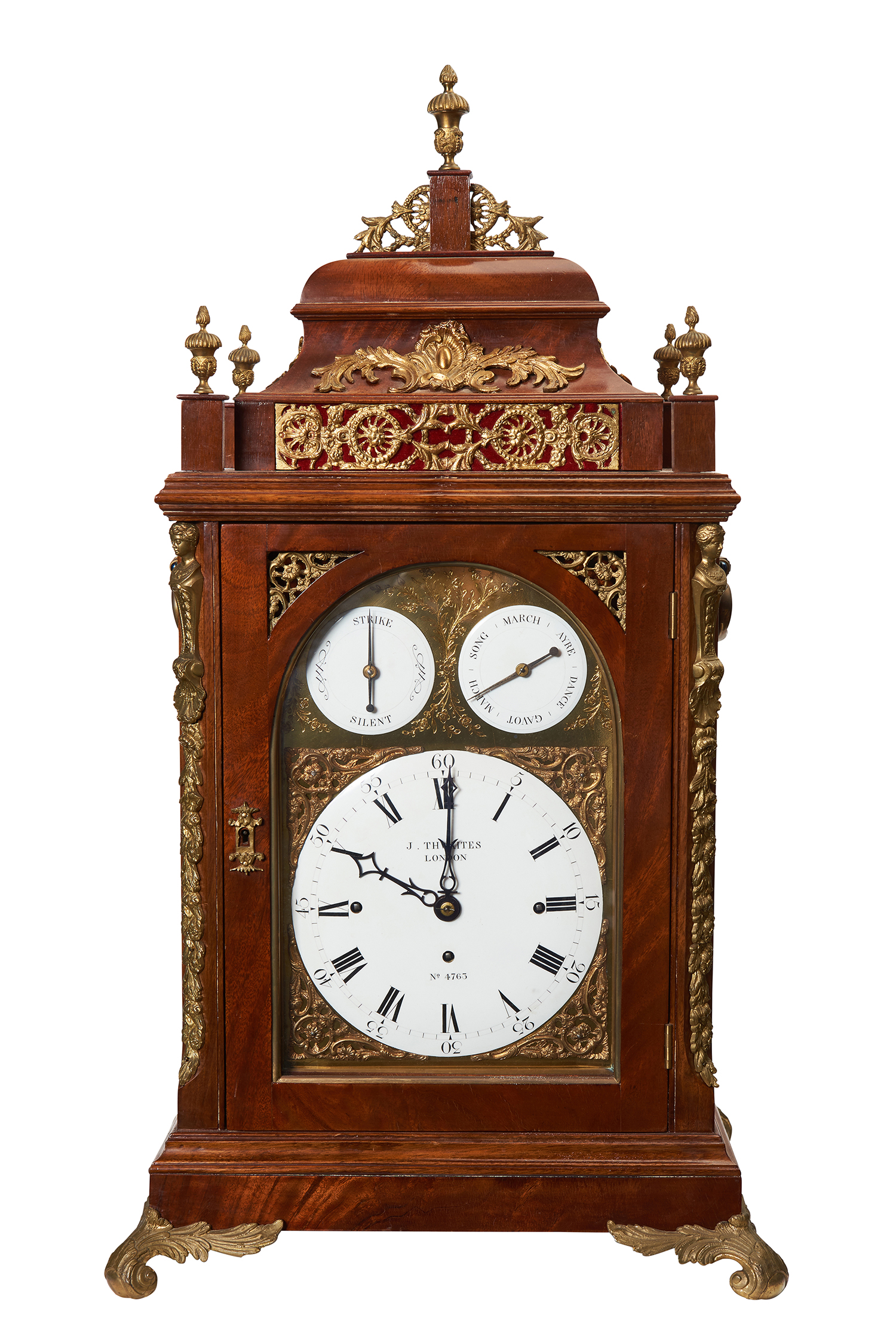 The mahogany brass lined bell top case with Rococo finials, each angle mounted with brass herms trailing leafy buds. The sides with brass handles above foliate case sound frets with quarter frets to the brass lined front and rear doors. The moulded base raised on leafy scroll cast brass feet. The enamel one piece dial with two smaller subsidiary dials in break arch, and strike/not strike and the tune selector dial. Main dial with Roman and Arabic chapter ring, signed J. Thwaites- London- No. 4763. Blued steel hands throughout. The triple fusee movement with verge escapement, hour striking on bell, the music playing on twelve bells on a six tune musical barrel. The glass inset rear door opening to a rectangular plate engraved with scrolling foliage