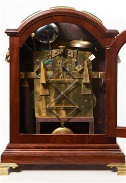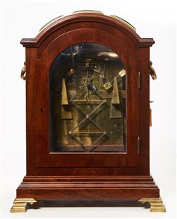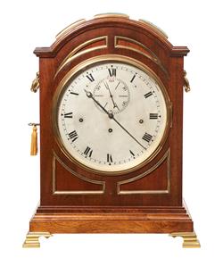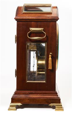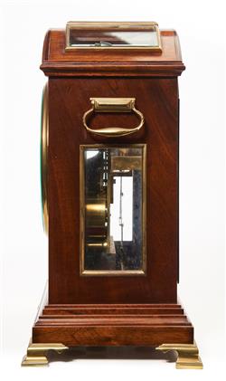 The break arch case with three brass trimmed rectangular glass panels set into the top of the arch. Circular cast brass bezel with brass inset panels above the dial and two brass inset panels below dial. Brass carrying handles to each side above brass bound glass side panels. The moulded base on brass bracket feet. The circular silvered brass dial with seconds dial above centre arbour having engraved Roman numerals. The three train fusee movement with deadbeat escapement, maintaining power is of eight day duration, quarter chiming on eight bells with two tunes selected at rear. With rhomboid pendulum