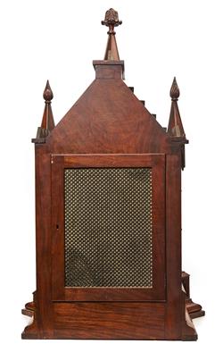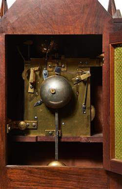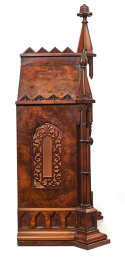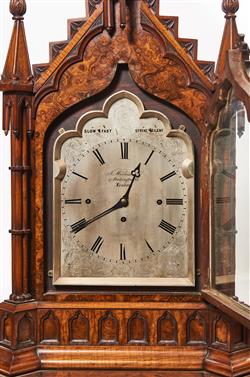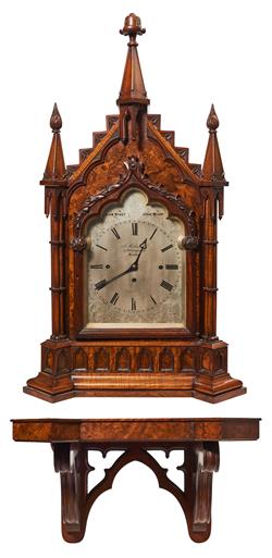 The case of Gothic style, walnut veneered with three spires to stepped top of case. The arched door with scalloped top flanked to each side with cluster columns. The case decorated to front and sides with inset Gothic panels. The whole clock mounted on original bracket. The one piece silvered dial with Roman numerals engraved to dial corners, also engraved slow/fast, strike/silent around arbours in dial arch. The dial signed I. Morrison- 27 Packington St- London. The three train, eight day going, fusee movement with anchor escapement chiming the quarters on eight bells