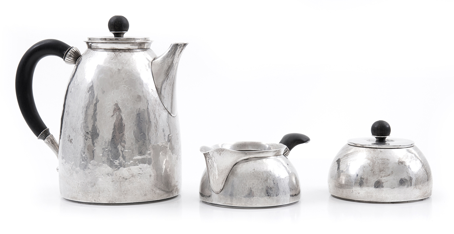 hand beaten, with ebonised handles and finials, approximately 828gms silver (including handles), tea pot measuring 16.5cm high