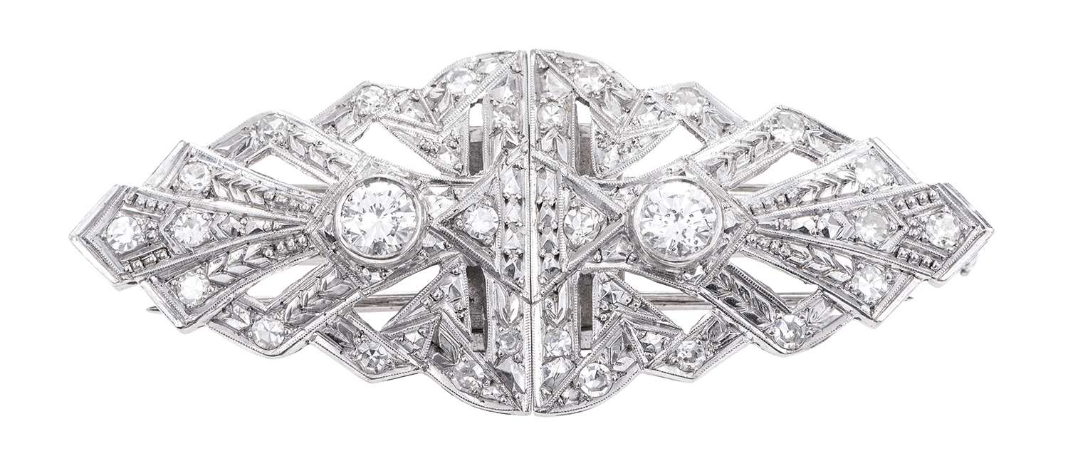 The diamond double clip set with two round brilliant cut diamonds totalling 0.75cts, within pierced and patterned panels set with twenty six single cut diamonds totalling 0.55cts, mounted in 18ct white gold.
