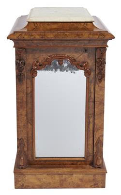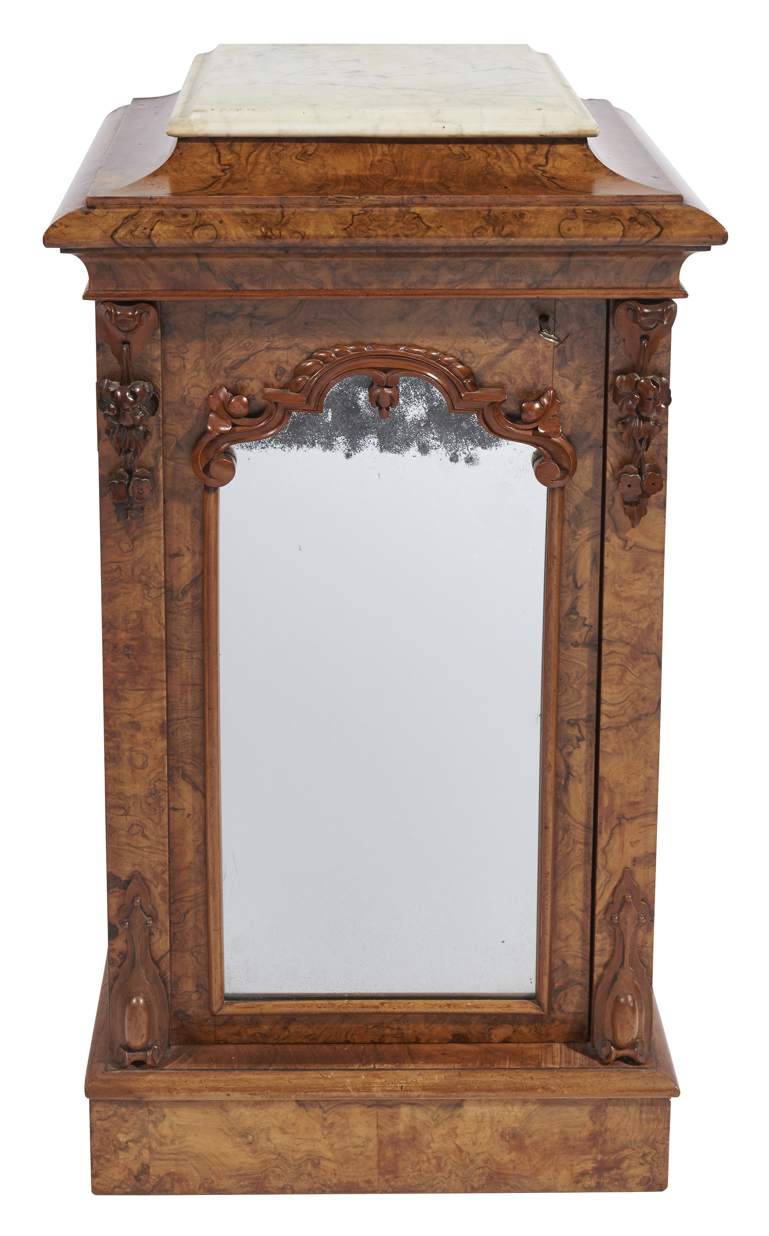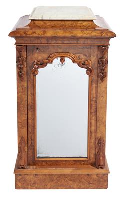 wear to body in places, mirrors faded consistent with age and use. keys present. felt interior replaced. minor chips to carving