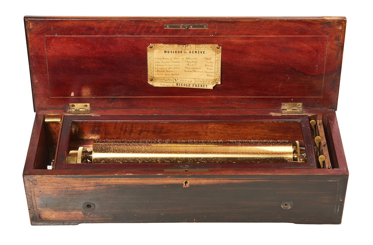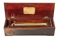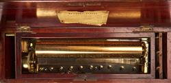 Floral marquetry inlaid to case. 33 cm cylinder. Lever wind. Ten tunes with tune sheet