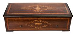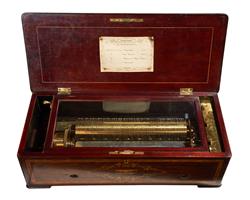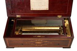 Floral marquetry inlaid to lid and front. 33.5 cm cylinder x 8 cm diameter. Four tunes with tune sheet. Lever wind