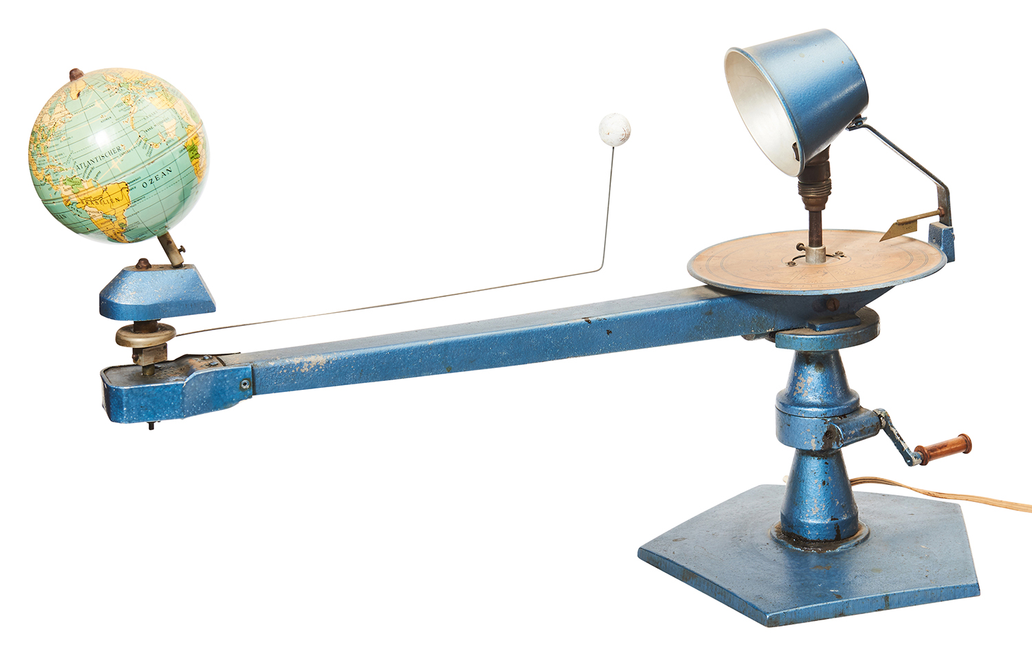 Student planetarium displaying the relationship between earth, sun and moon throughout the seasons. The earth globe on axis with electric light- the sun . Hand lever rotation