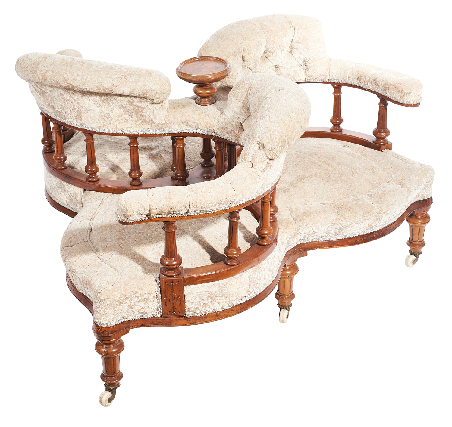 Upholstered in a rich cream coloured brocade fabric, with button detailing to back and arm rests