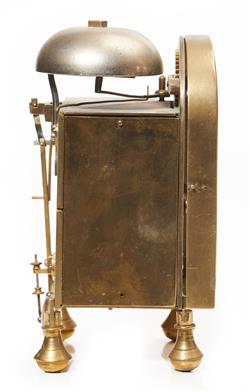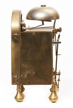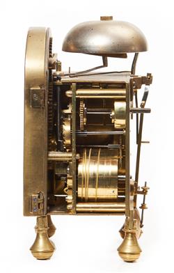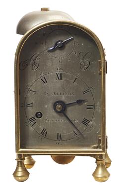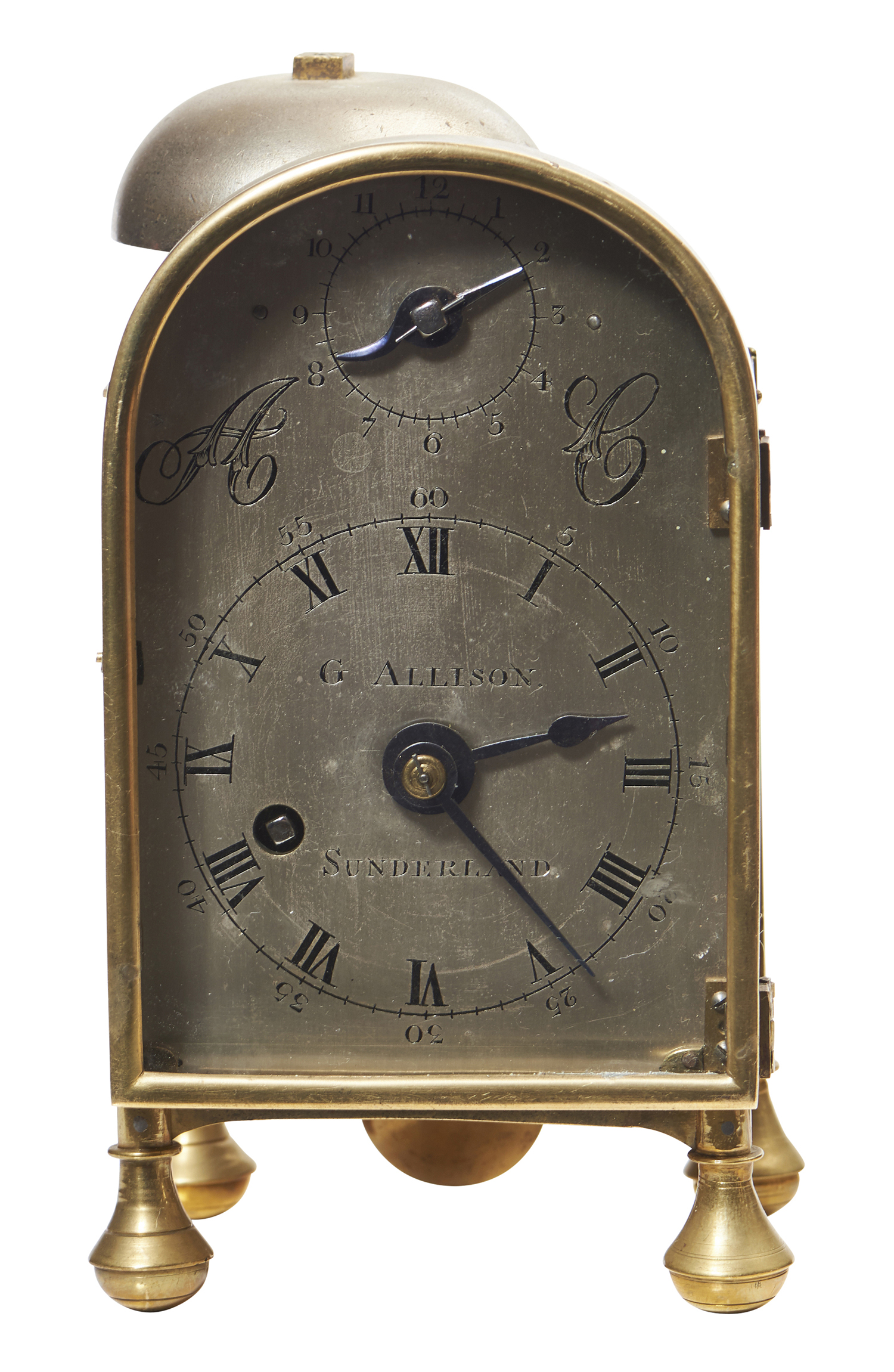 Square brass case with arch silvered dial signed G. Allison- Sunderland. Alarm set dial above time dial in arch
