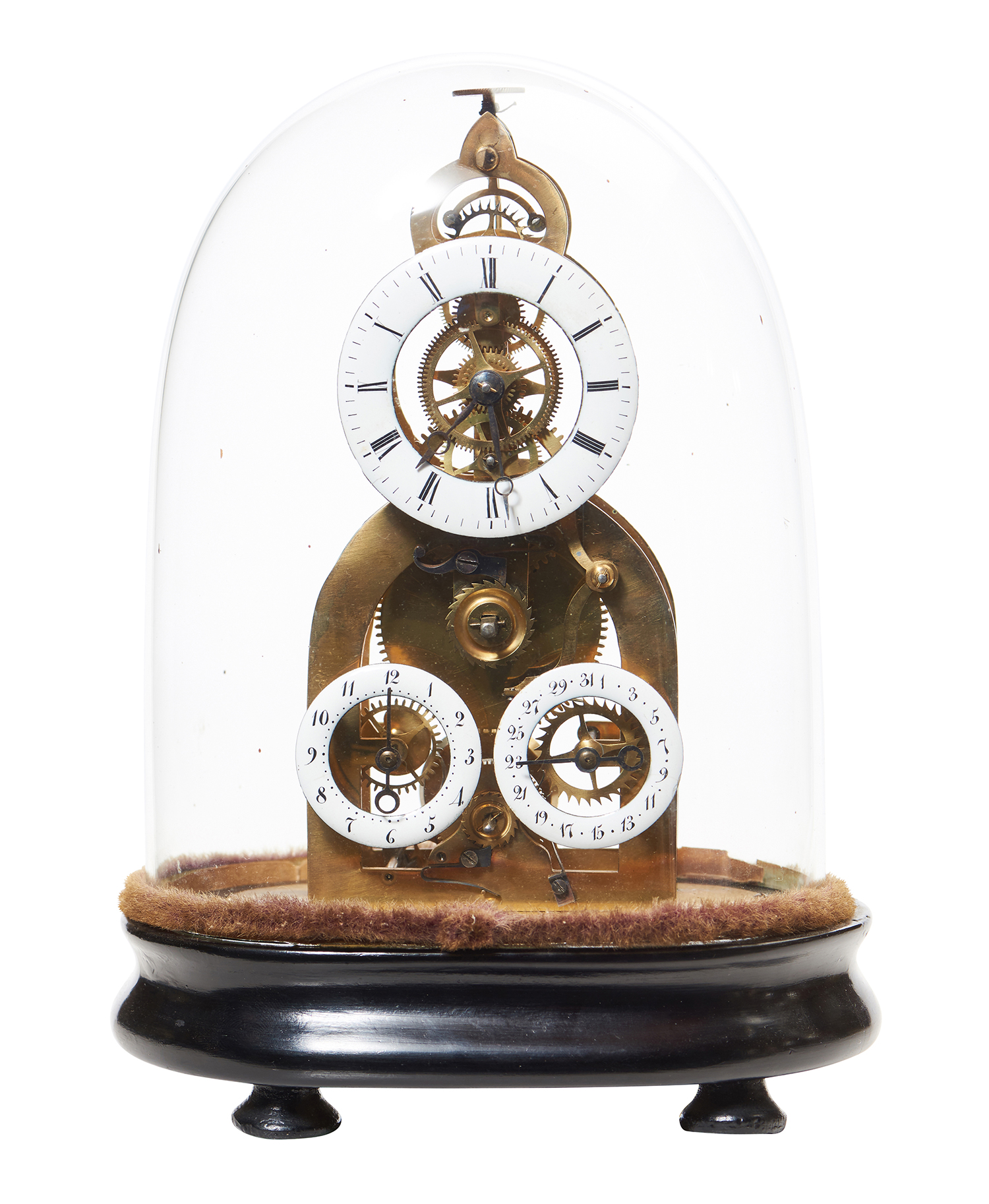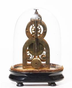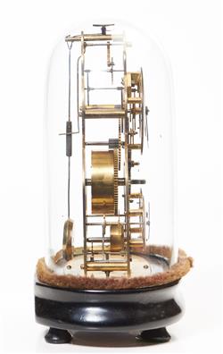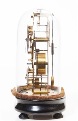 A white enamel band dial with two lower subsidary dials for date and alarm. Alarm bell within oval ebonised base, under glass dome. Dead wheel escapement with silk suspension pendulum