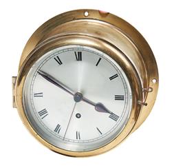 The circular dial with Roman numerals, in a brass surround. Fusee movement