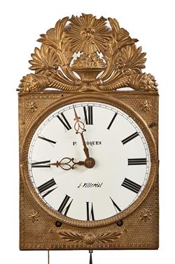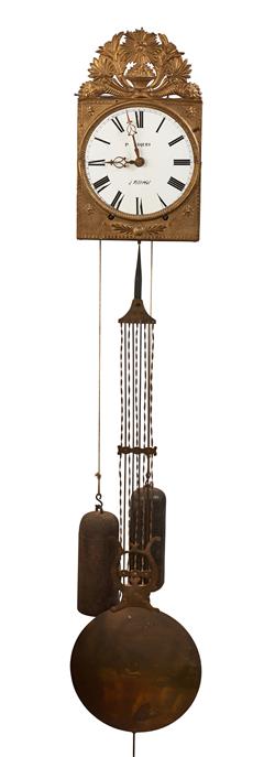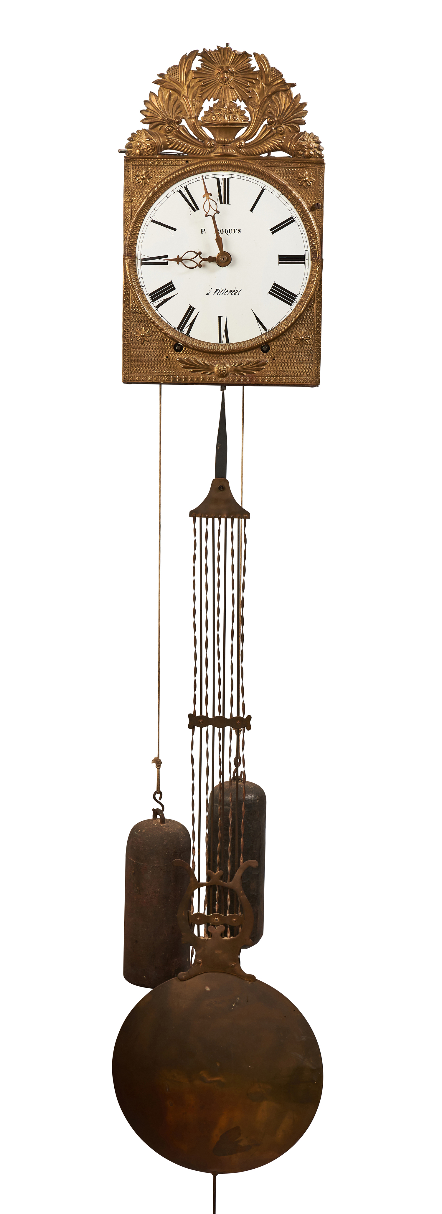 The rectangular metal case with decorative pressed brass surround. The crest of sunburst design with stylized cornucopia on each side. The circular white enamel dial with Roman numerals, the chapter signed P. Roques- Villereal. The two train, weight driven movement of one month duration striking the hours on a bell. Verge escapement and rack striking with gridiron pendulum and large brass bob