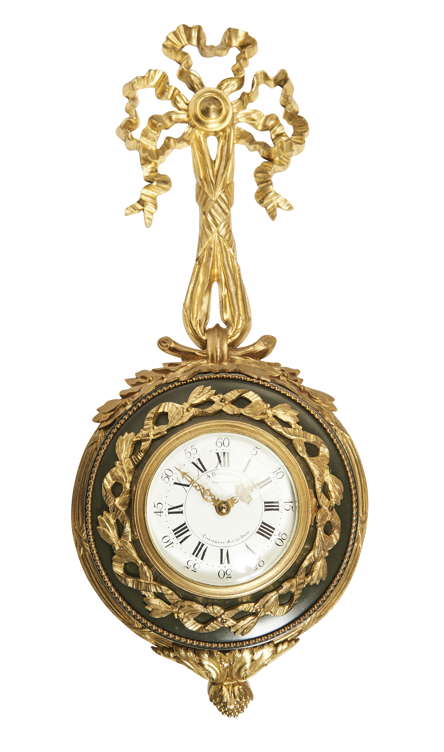The gilt metal ribbon formed handle cradling the circular case, electric battery driven clock