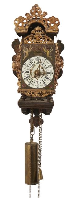 The hand painted dial with painted cherub spandrels and Roman numerals. Weight driven Striking on bell