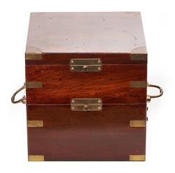 The square mahogany box in three tiers with small brass side handles and brass corner pieces. Silvered and engraved dial, signed Robert Molyneaux- 30 Southampton Row London No 2344 above centre arbour with subsidiary seconds dial below centre arbour. Circular plate movement joined by ringed pillars, chain and eight day fusee movement with maintaining power. Tipsy key