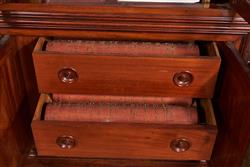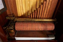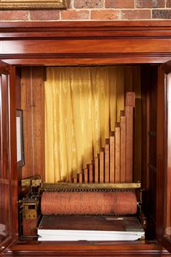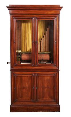 A rectangular mahogany cabinet with a pair of glazed doors to the upper section, providing access to the organ above a pair of blind panelled doors to the lower section. Behind the lower doors three full width drawers each with holders for two music barrels for the organ. Music mainly by Rossini. Weight driven movement with spiral action controlling bellows and supplying air to thirty two wooden pipes.