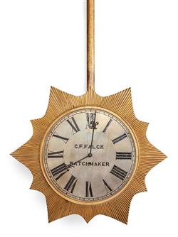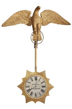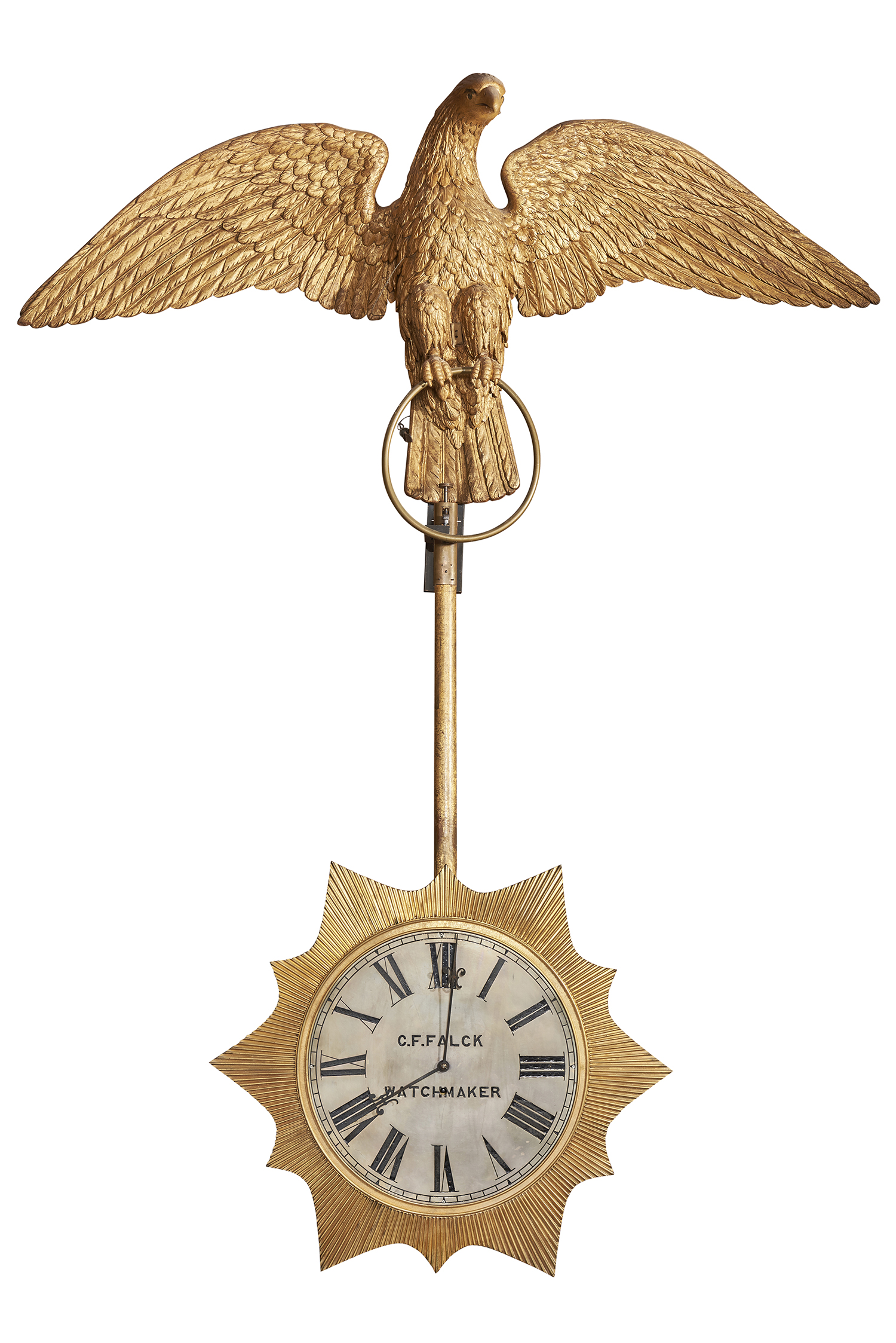 The silvered dial signed C. F .Falck- Melbourne, within a reeded gilt brass sunburst surround. The whole suspended by a carved gilt wood eagle with outstretched wings. Eight day fusee movement with dead beat escapement wound from the front.