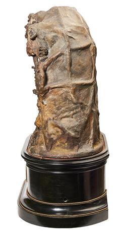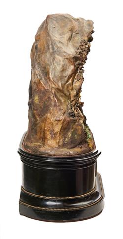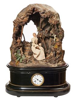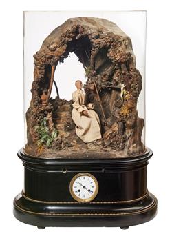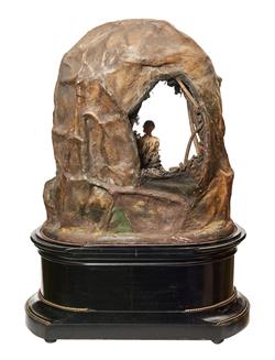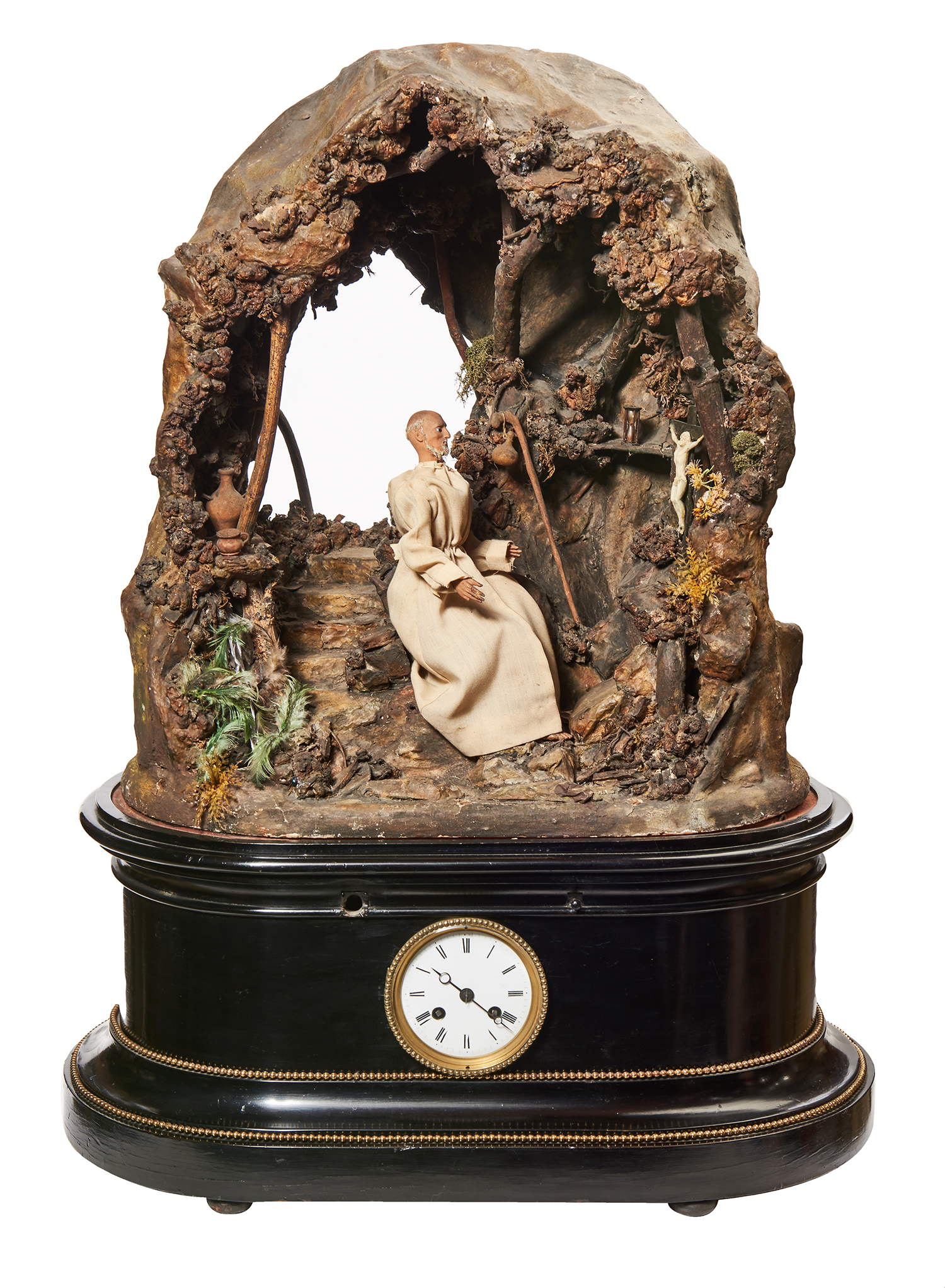 Mechanical piece under purpose made perspex dome representing a monk or hermit seated in grotto decorated with religious symbols. When music plays, the figure stands upright and then kneels at the altar in front of him. The left hand of the figure moves with two actions. The right hand has six movements enabling the figure to cross himself and pray at various times with nodding of head and movement of mouth. All performance takes place with hymns being played on a four tune musical box. At the end of the music the figure stands and then seats itself on the rock seat.