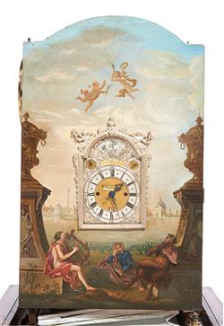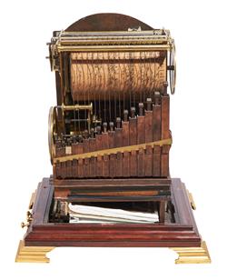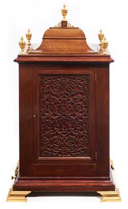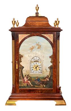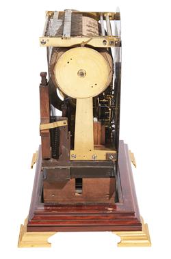 The large mahogany bell topped case with five gilt brass urn finials at each corner of the case and one located centrally on small reeded plinth. The case with full length pierced side frets with a pair of pierced gilt brass sound frets to the top corners of arched front door. Stop fluted front corners to full height door. Moulded vase supported on gilt brass feet. The arched painted dial with allegorical scenes and automotive figures operated by movement. A smaller break arch, silver framed dial located centrally in the painted dial. The clock with Roman and Arabic chapter ring framed by silver mounts and pierced door spandrels. Above the chapter ring are two subsidiary dials for rise and fall regulation and pendulum lock. Below centre arbour a curved calendar aperture, engraved day disc in arch. The two train eight day fusee movement with verge escapement and hour, bell striking. The organ plays on seventeen oak stopped pipes plus seventeen octave stopped pipes and seventeen shaded. The organ with 20.8 cm diameter wooden barrel, 30.5 cm long and plays nine tunes. Movement with one speed regulator to the movement and three stop selector slides.