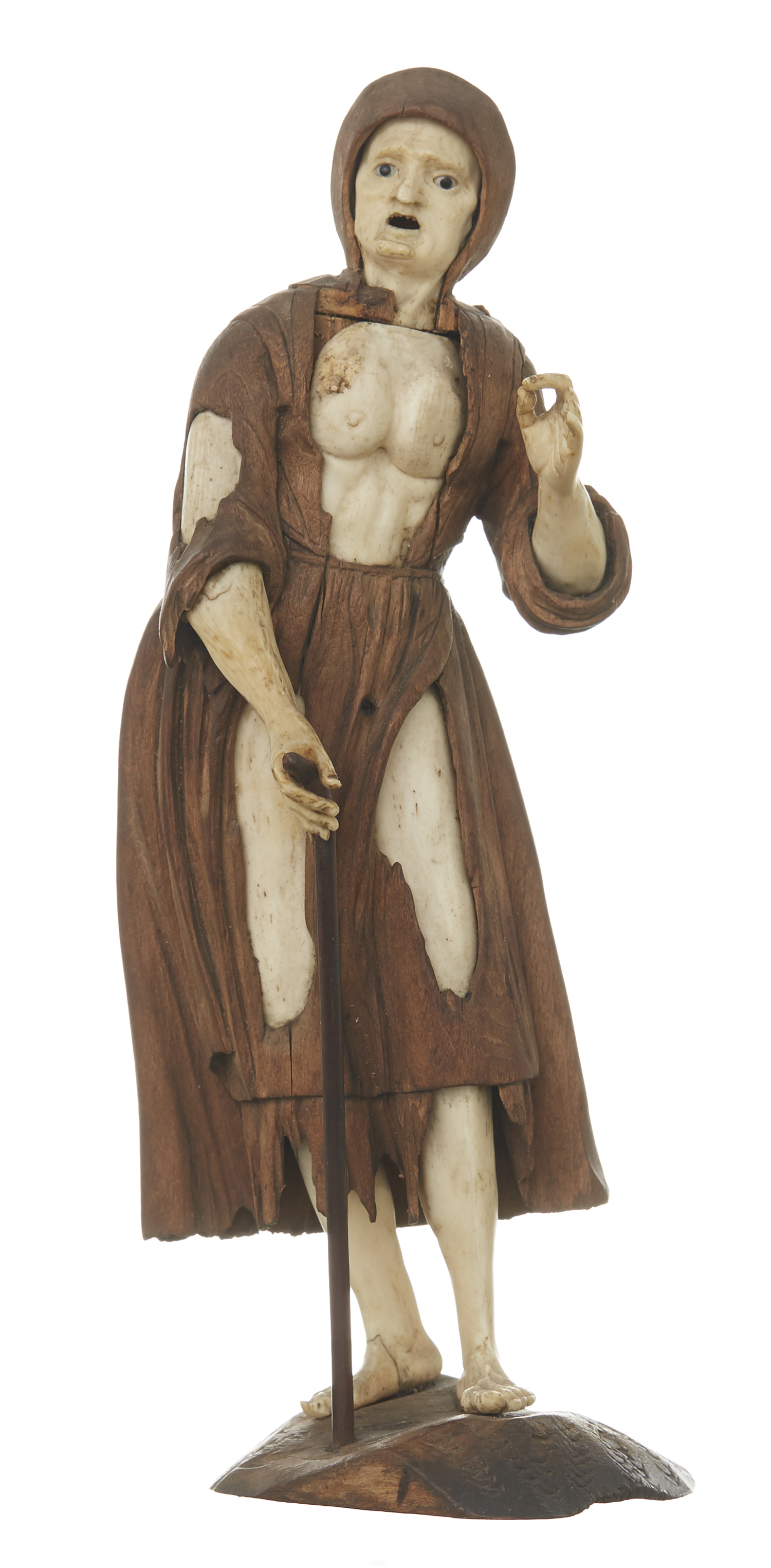 A GERMAN 18TH CENTURY BONE AND WOODEN FIGURE OF A BEGGAR