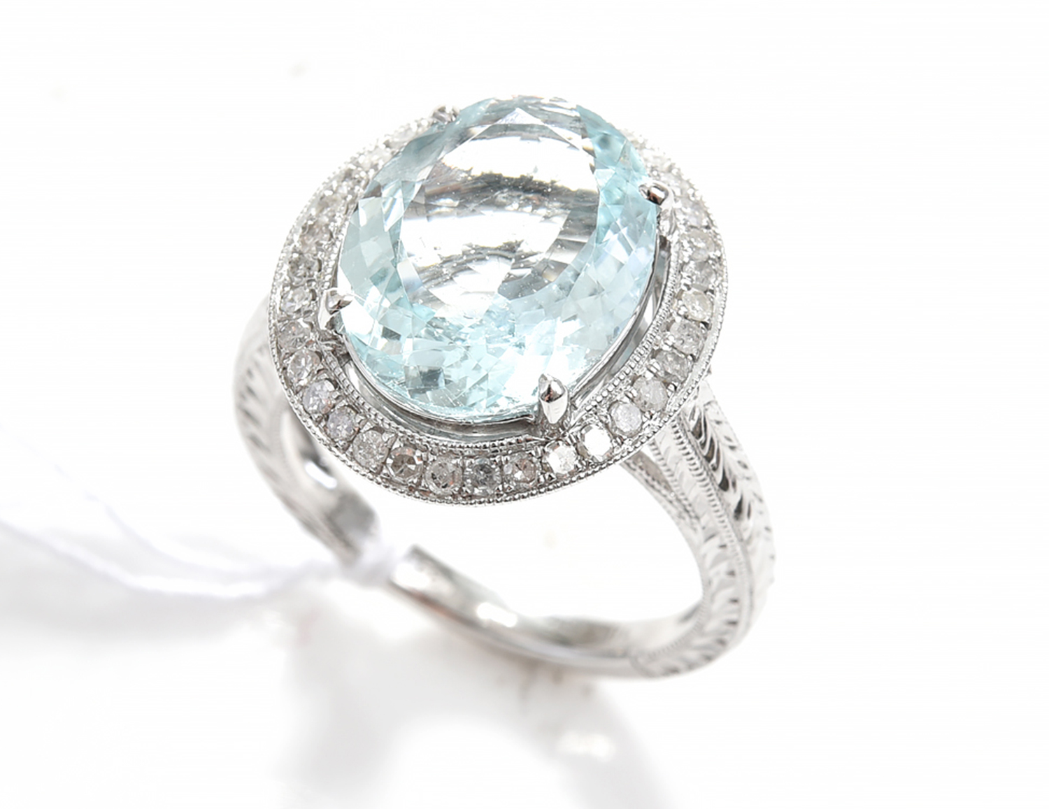AN AQUAMARINE OF 4.34CTS AND DIAMOND CLUSTER RING IN 18CT WHITE GOLD, SIZE N