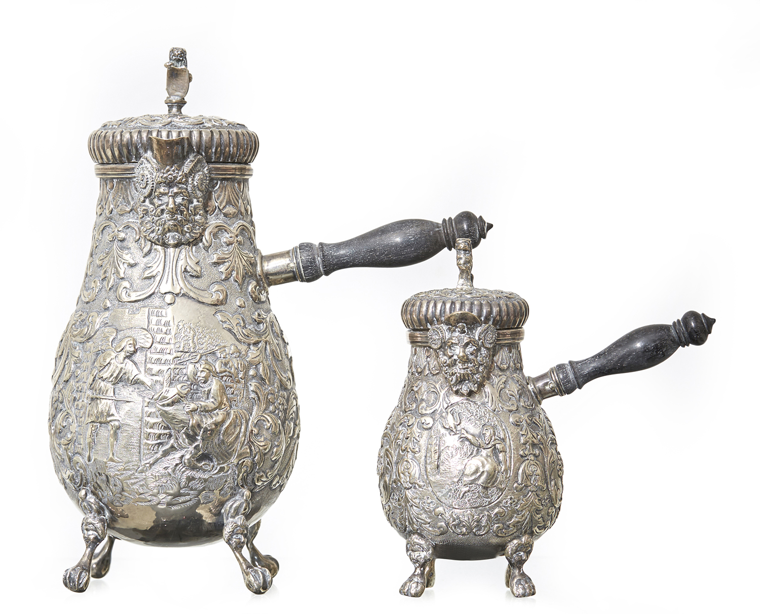 Each embellished with biblical scene and with turned ebony handles, 21cm high (2)
