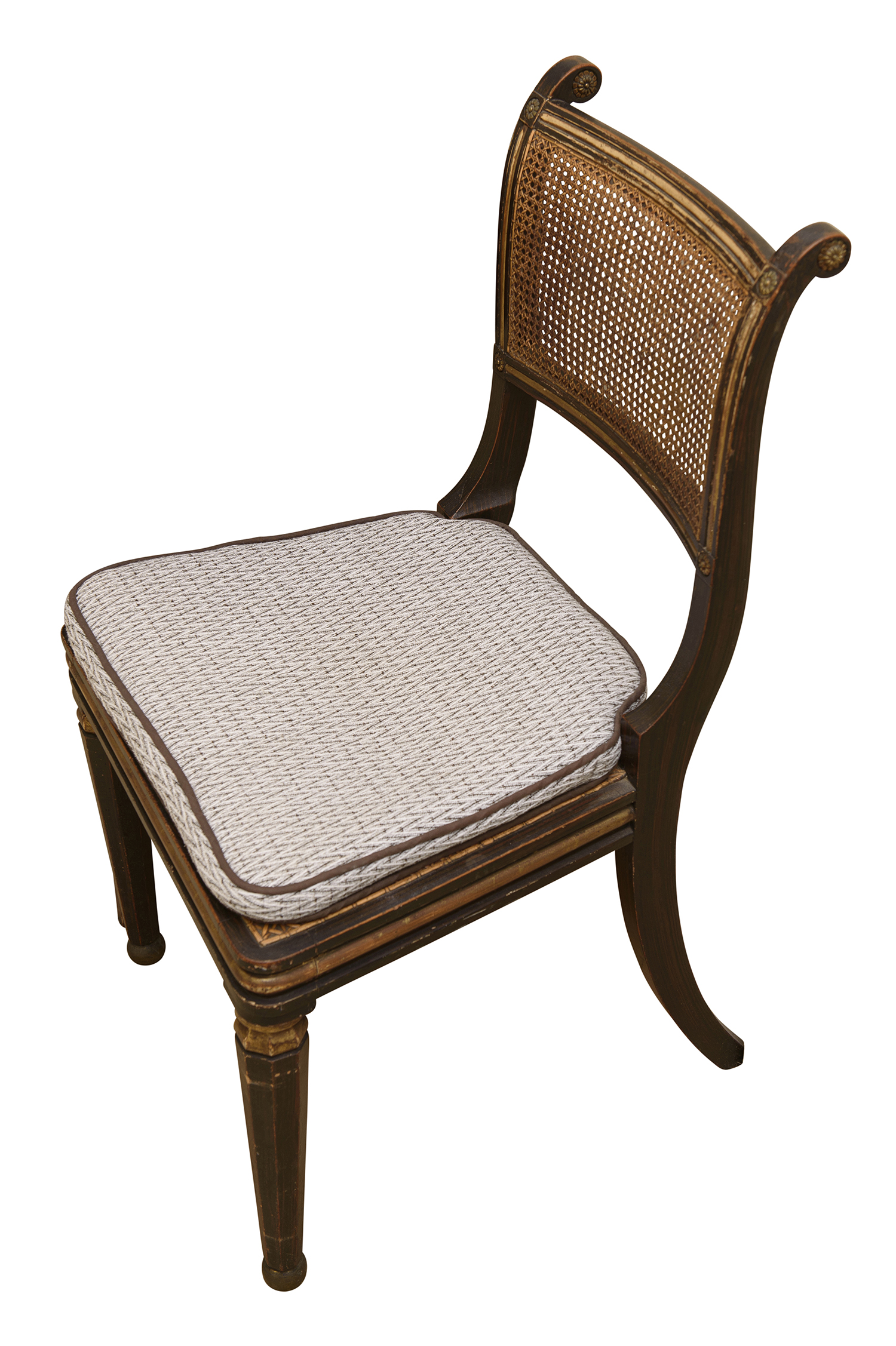 each with painted gilt decoration, supported on fine turned front legs and caned seats
