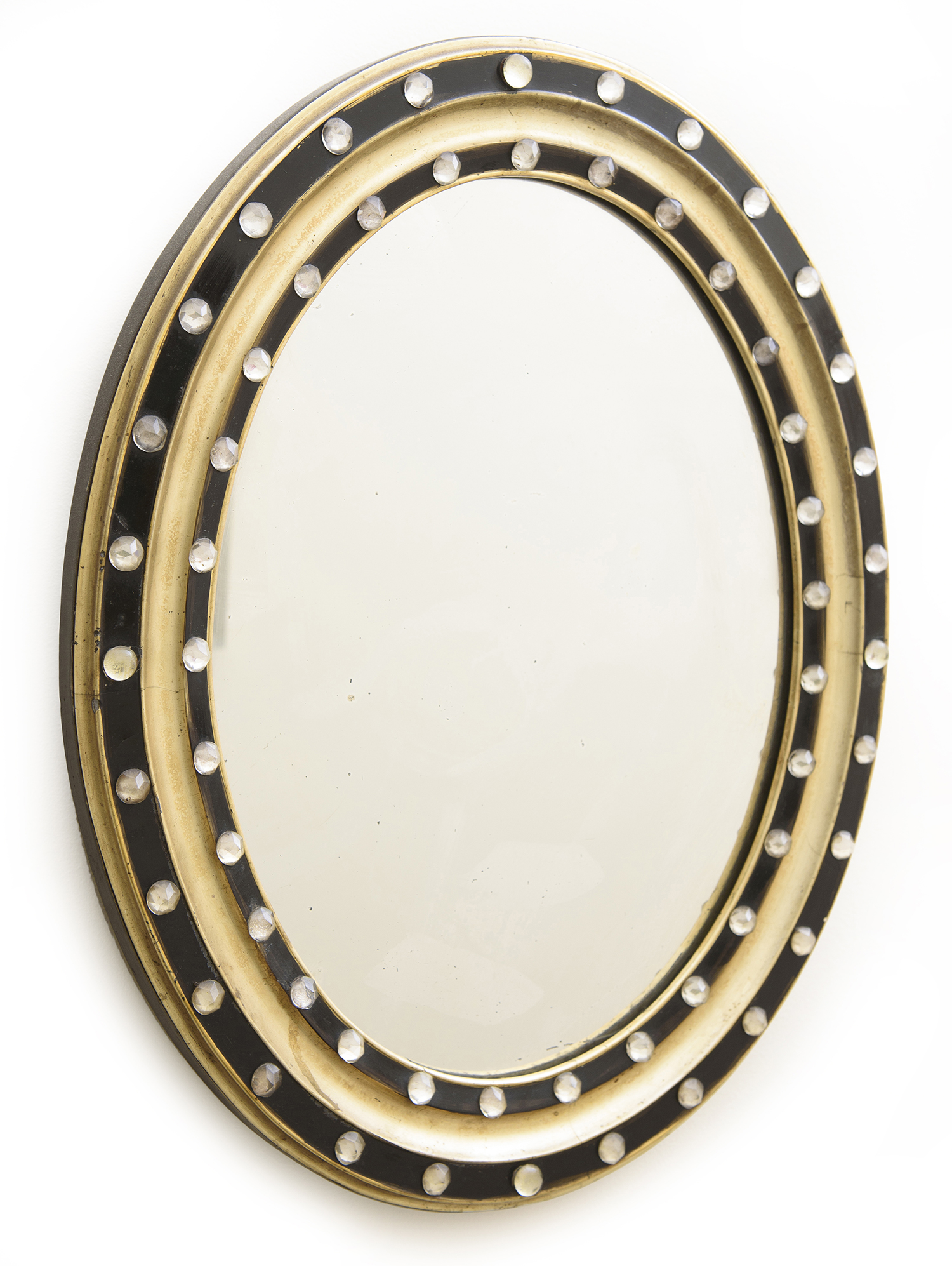 the oval mirror painted in silver and black detail with applied cabochons, the mirror 55 x 46cm