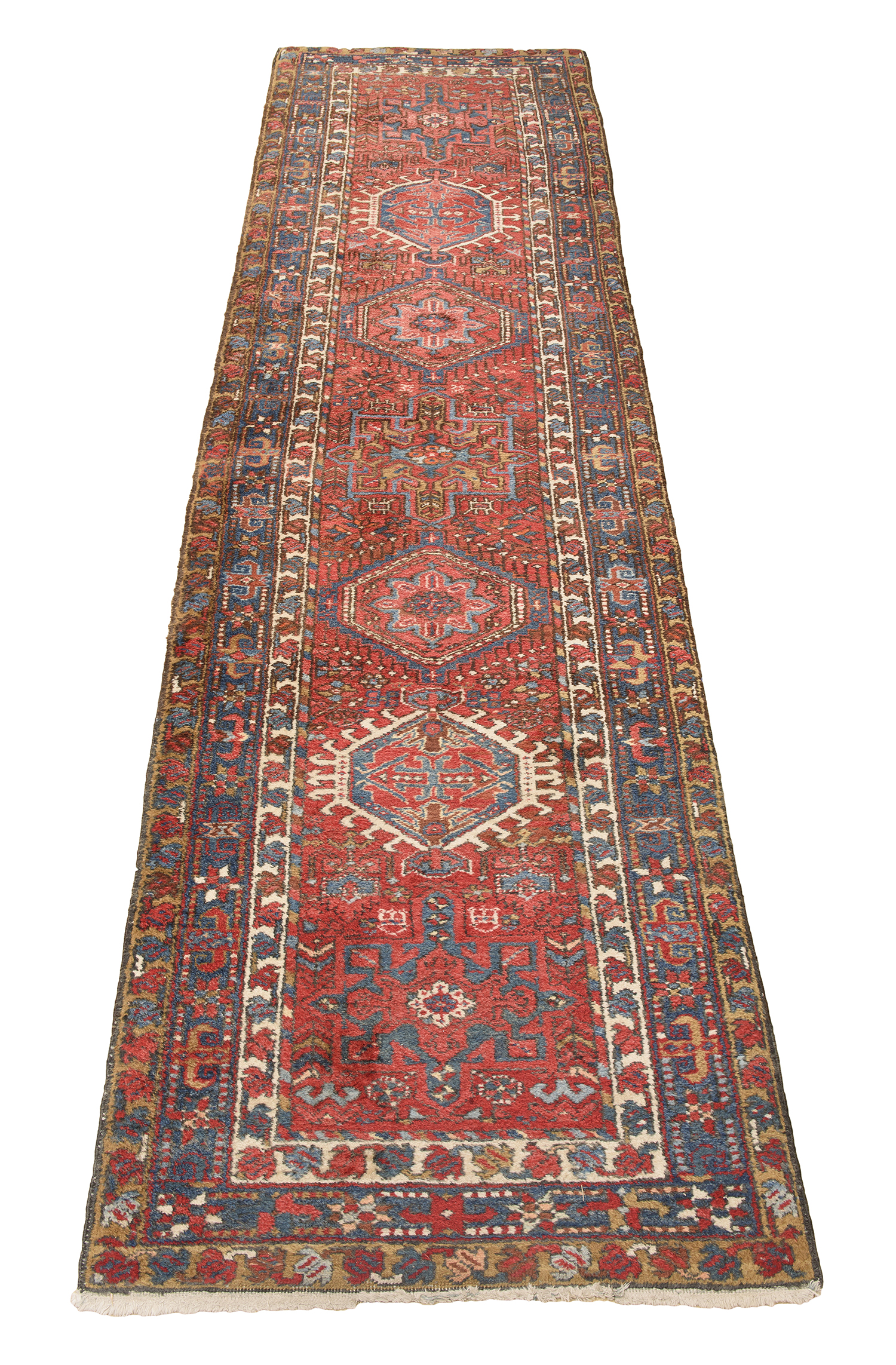 with central geometric design all on a deep red ground with dark blue tones, 329cm x 89cm