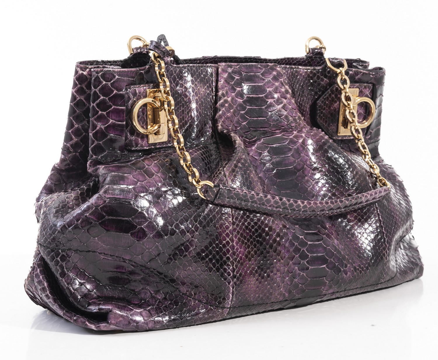 Styled in purple dyed snakeskin leather with gold metal hardware, 25 x 38 x 15cm.
