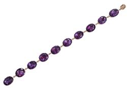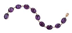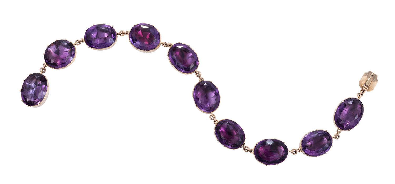 Comprising nine oval faceted amethysts to foil backed fittings, mounted in 15ct gold to an amethyst set clasp, total length 210mm, circa 1840.