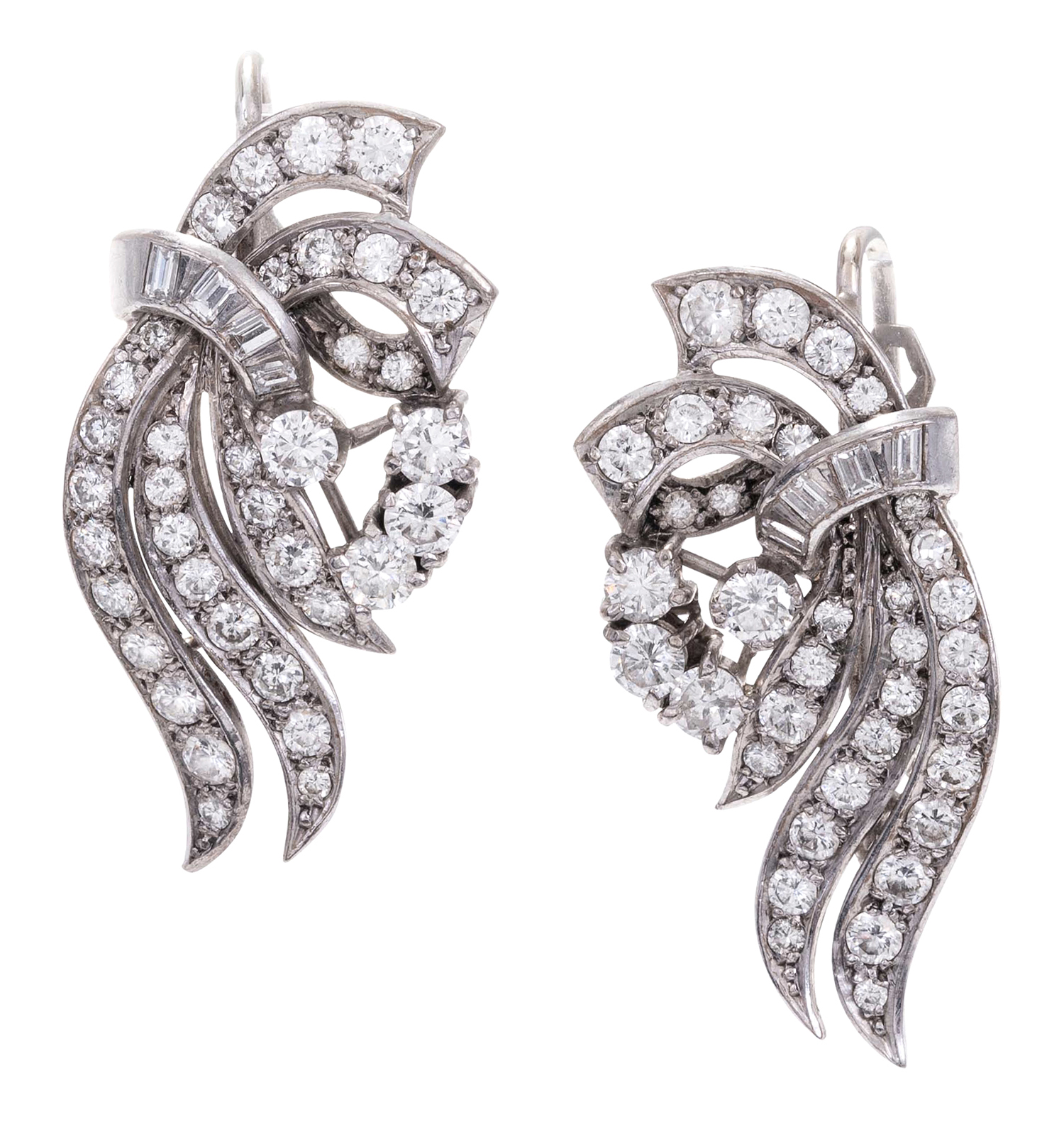 Of spray design, each comprising baguette and round brilliant cut diamonds totalling 0.75cts, mounted in 18ct white gold.