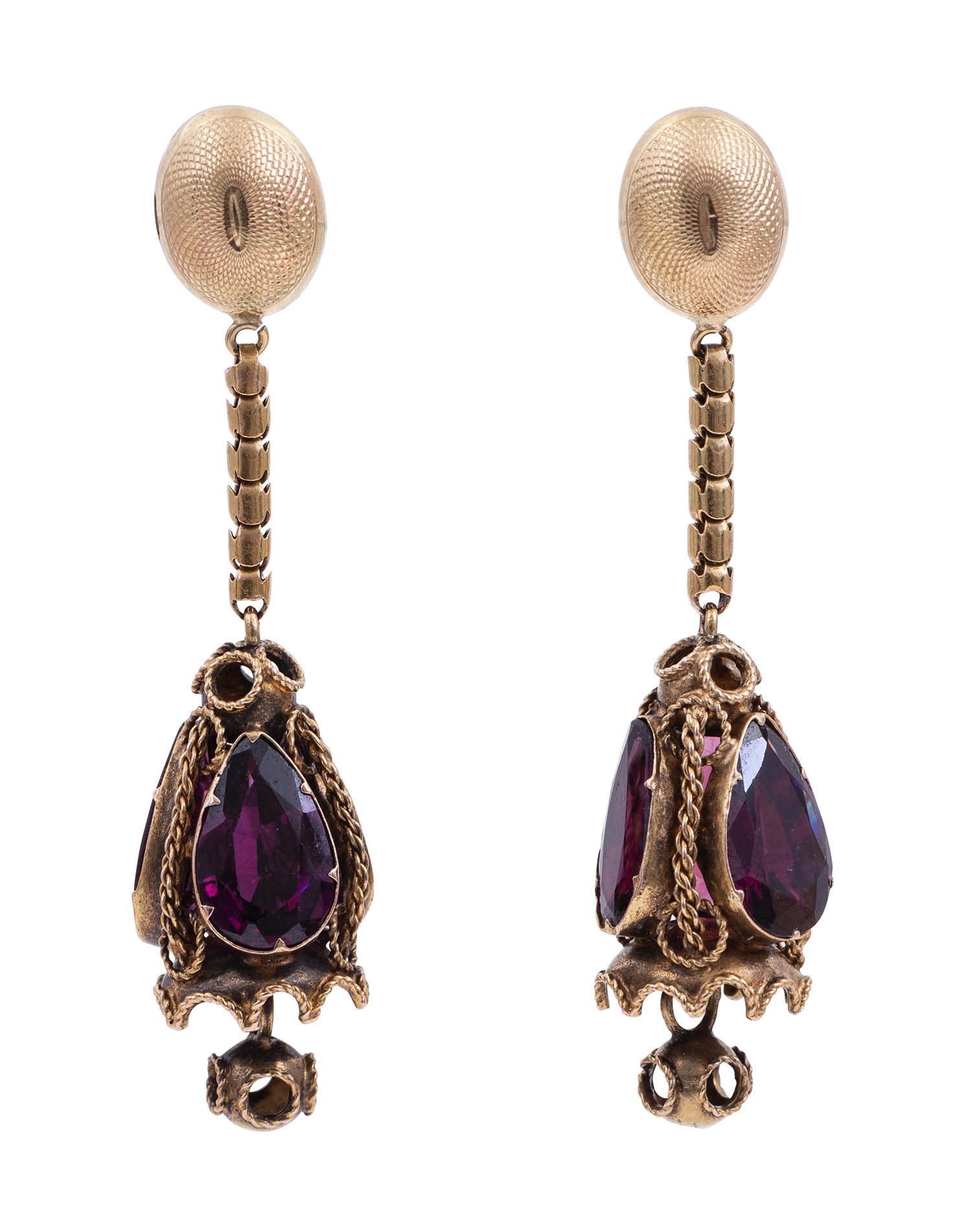 Each earring comprising three pear cut faceted garnets within lantern style fittings, suspended from an articulated drop, mounted in gold.