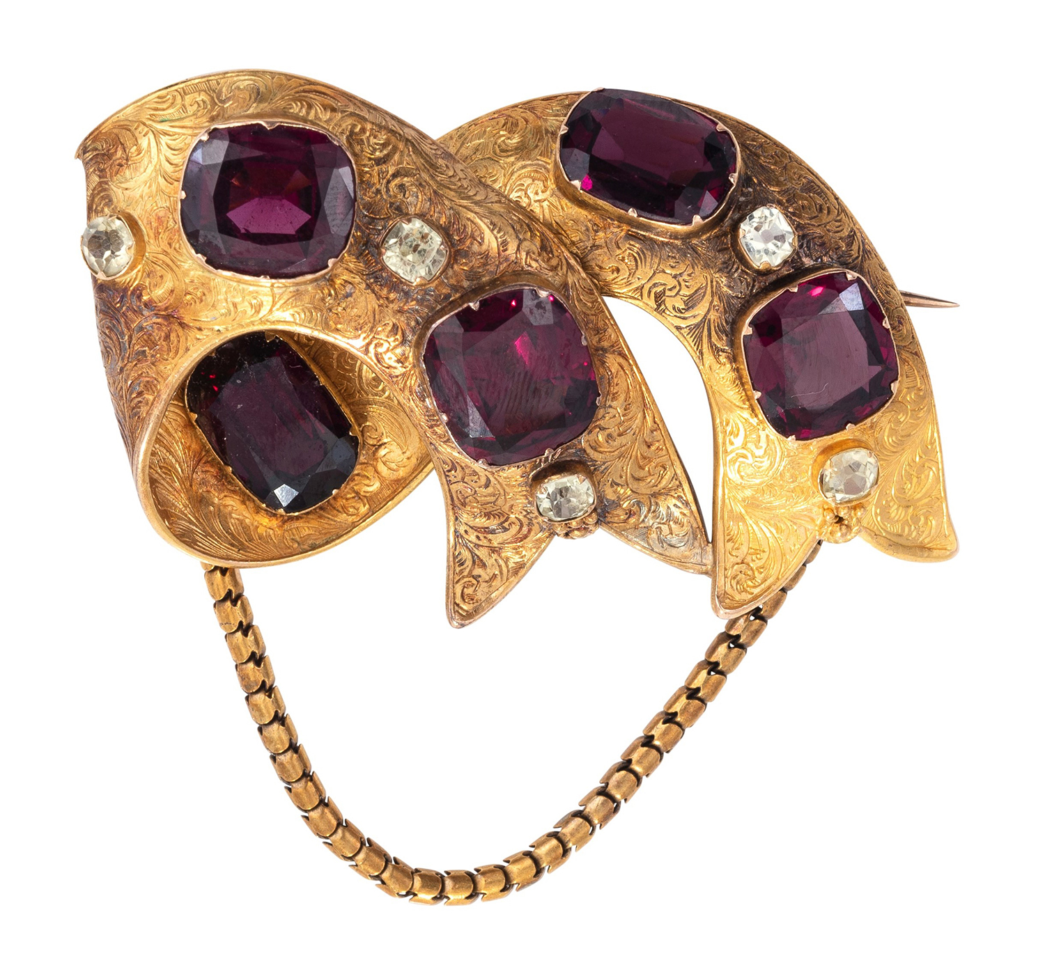 Styled as an overlapping ribbon, with foliate engraved detail, set with garnets and paste stones, mounted in 14ct gold.