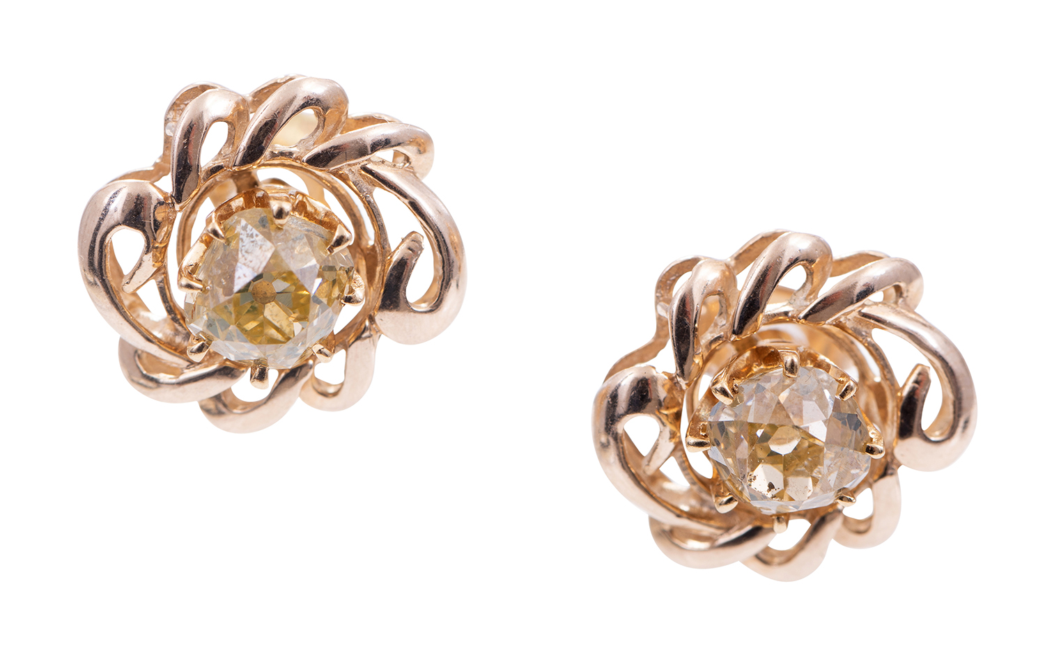 Old European cut diamonds graded in the mount as colour Fancy Yellow, clarity SI and I respectively. Not all dimensions of the diamonds are accessable in the mount therefore the weight of each stone is estimated at 0.75cts.