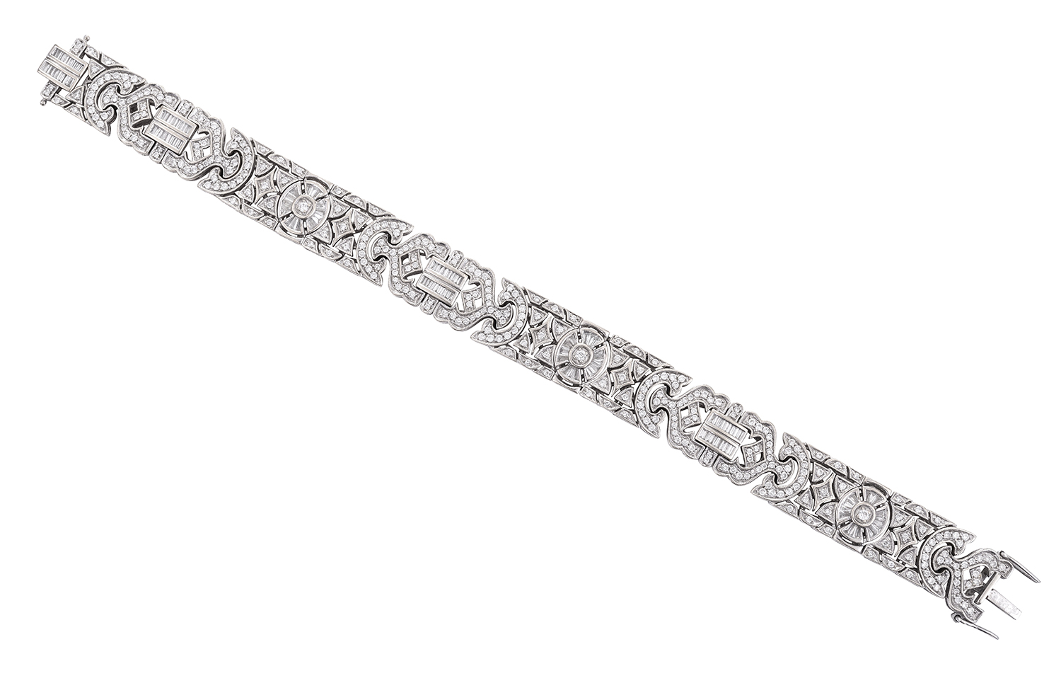 The art deco style diamond bracelet set with tapered baguette and round brilliant cut diamonds totalling 5.00cts, mounted in 18ct gold, length 195mm.